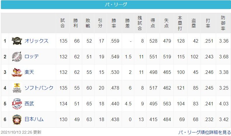 <パリーグ順位表>