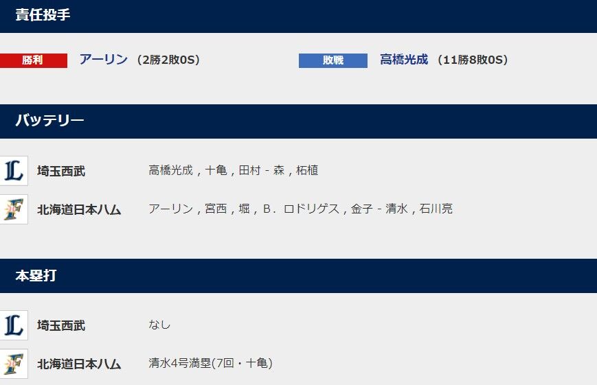 2021.10/13-試合結果【西武×日本ハム】(札幌ドーム)は2-10で西武が負け・・先発高橋光成が7回途中7失点で8敗目。。西武、CS進出完全消滅・・・