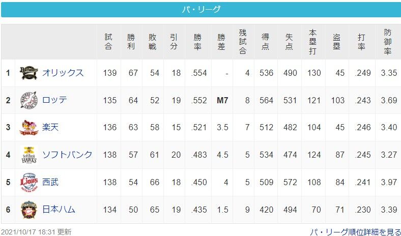 <パリーグ順位表>