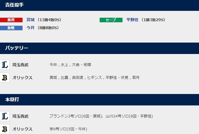 2021.10/21-試合結果【西武×オリックス】(京セラドーム大阪)は2-3で西武が負け・・・先発今井が6回3失点で8敗目。。ブランドン&山川にホームランんが出るが勝てず・・・