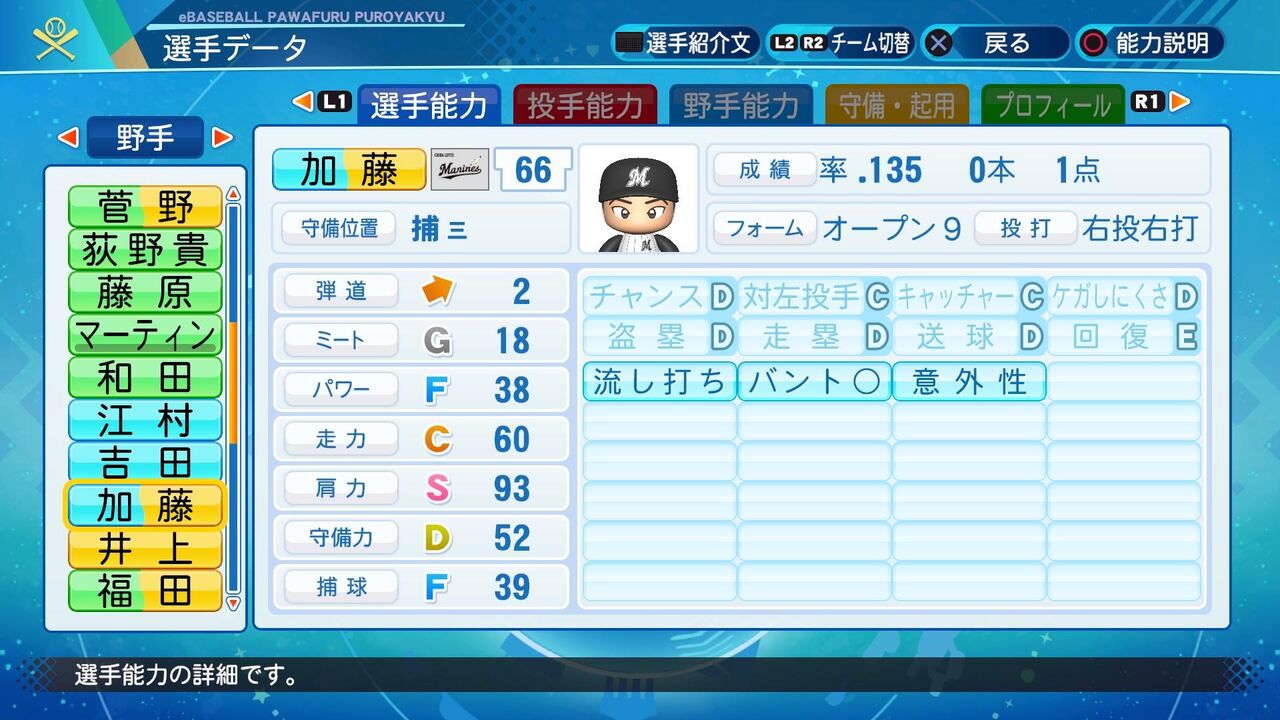 加藤 123打席 打率.095 出塁率.128 OPS.300 捕逸5 失策1