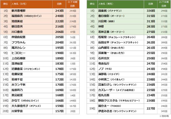 テレビ番組・CM調査分析会社のエム・データによる「2022年上半期TV番組出演ランキング」では、1位の設楽統を筆頭に上位に帯番組MC陣が並ぶ中、なんと2位につけている。