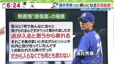 涌井(36)「点が入ると思うから疲れる。ダル(36)や杉内(42)と投げ合ってたときは1点取られたら負けだった」