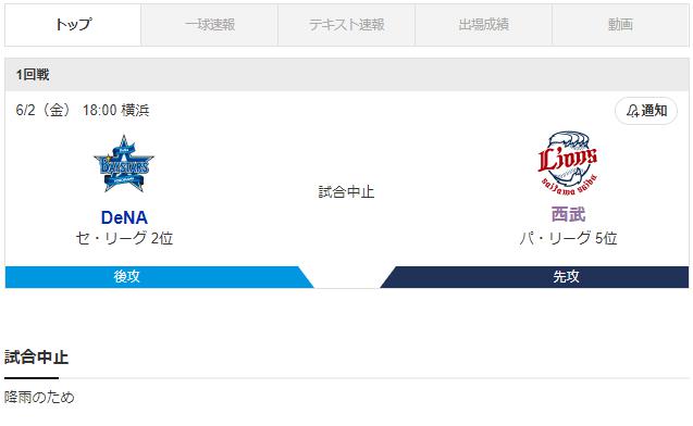 横浜のDeNA-西武(1回戦)は、雨天のため中止が発表されました。#baystars #seibulions
