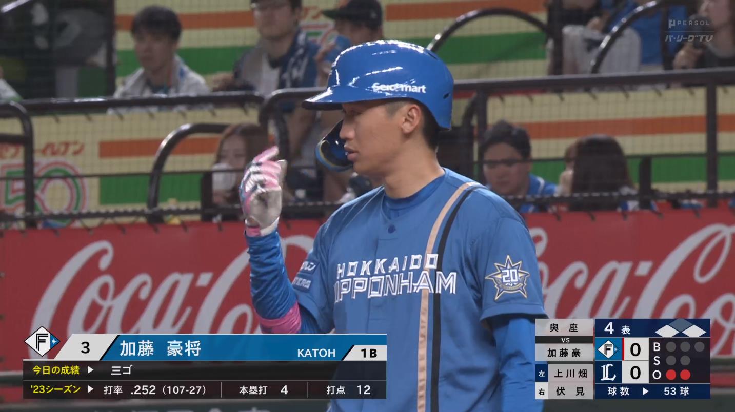 ◎日本ハム・加藤豪は試合前の守備練習を終え、顔に大量の汗。冷房がないベルーナドームに「ドームって名前なのに、なんで穴が開いてるんですかね?」。穴ではなく、壁がないんです…。