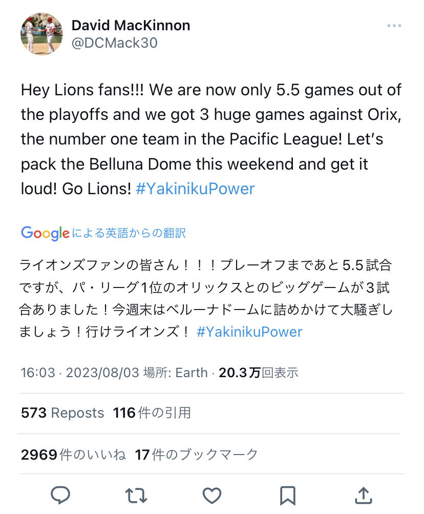 Hey Lions fans!!! We are now only 5.5 games out of the playoffs and we got 3 huge games against Orix, the number one team in the Pacific League! Let’s pack the Belluna Dome this weekend and get it loud! Go Lions! #YakinikuPower