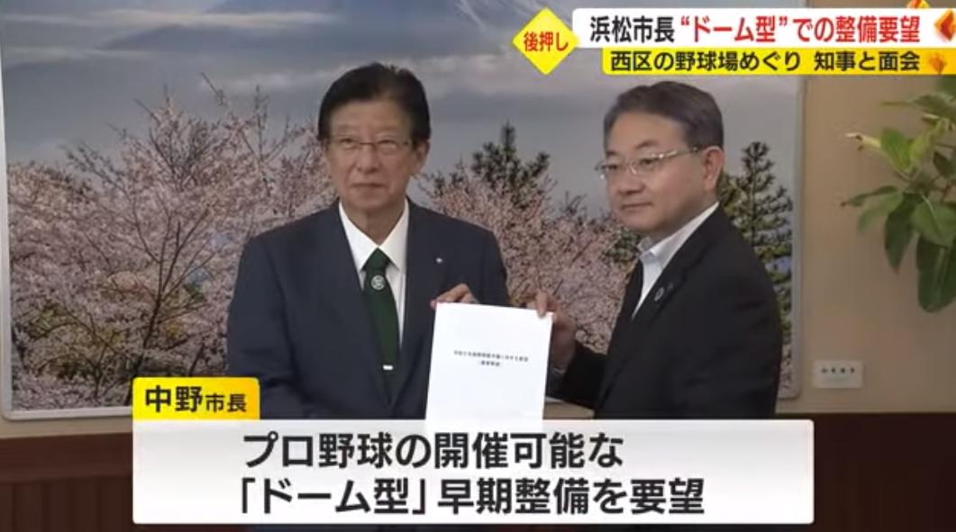 こうした中、浜松市の中野市長は12日に予算要望のため県庁を訪れ「スポーツの力はまちの魅力を高める」とプロ野球の開催が可能な「ドーム型」での早期整備を川勝知事に求めました。