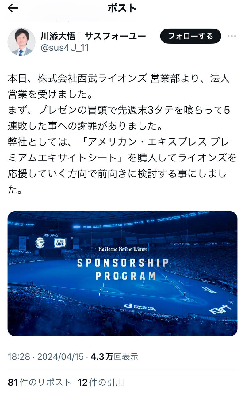 【悲報】西武ライオンズ営業、営業先で3タテを含む5連敗を謝罪する