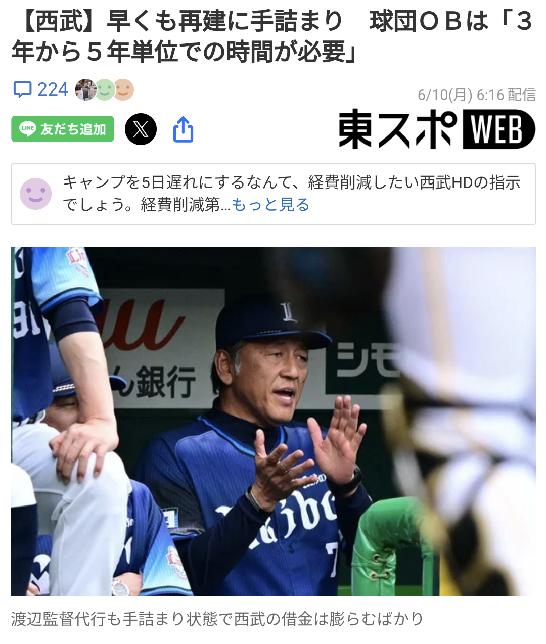 西武OB「渡辺久信は現実を直視しろ。小手先でどうにかなるレベルじゃない。立て直しに5年はかかる」