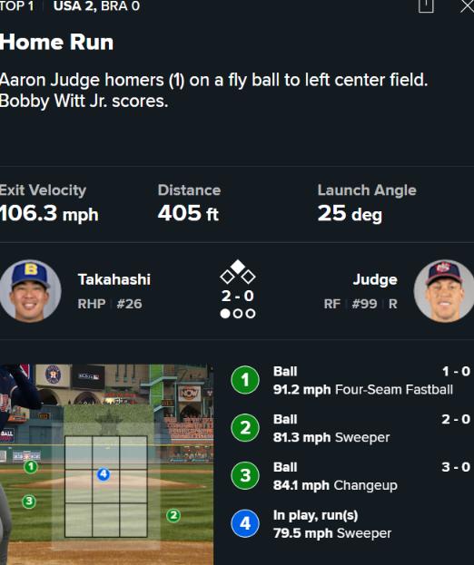 一振りで結果を出した。初回1死二塁、ブラジル先発、ボー・タカハシがカウント3―0から投じたスイーパーをこん身の力で叩いた。打球は高い弧を描き、左翼席へと一直線。打球速度106.3マイル(約171.0キロ)、飛距離405フィート(約123.4メートル)、角度25度と長距離砲らしい美しい弾道だった。先制点をもたらした主砲は悠々とダイヤモンドを巡り、ベンチで仲間達と喜びを分かち合った。